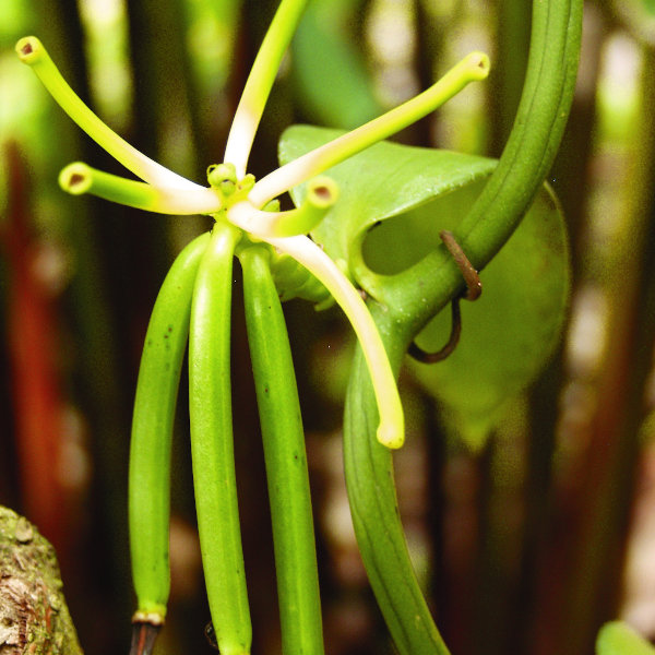 Las vainas verdes (mostradas en la foto) una vez maduras son cosechadas y cuidadosamente secadas bajo el sol para conservar su exquisito aroma. La mayoría del sabor viene de las miles de diminutas semillas que se encuentran dentro de cada vaina.